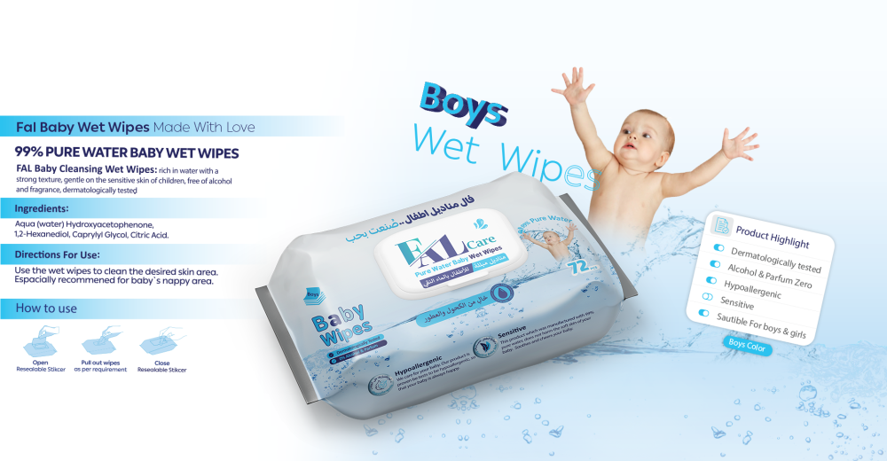 مناديل مبللة للأطفال بالماء النقي فال كير بتصميمها المخصص للأولاد تمنحك الثقة الكاملة في كل استخدام.